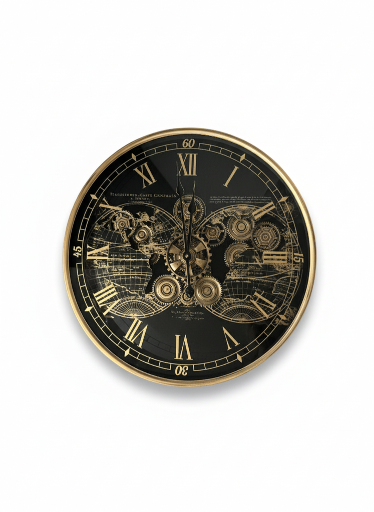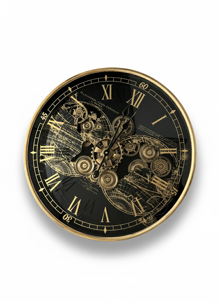 精巧なギアモチーフと世界地図のグラフィックが融合した、ギア ワールドマップ ウォールクロック。