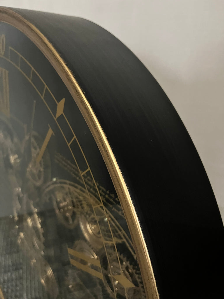 アンティーク調のゴールドラインが黒のフェイスに映え、クラシックとインダストリアルの魅力を併せ持つウォールクロックです。