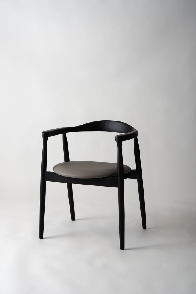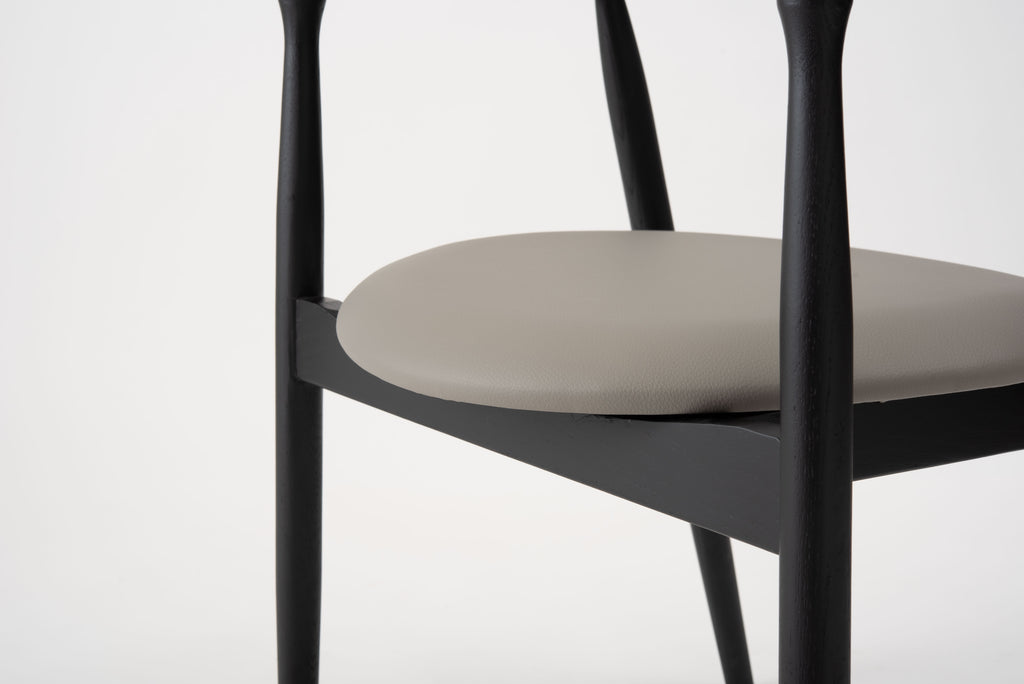 滑らかな曲線と上質な素材感が際立つアームチェア。背もたれからアームへと続く一体型のカーブは、丁寧に面取りされ、どこに触れてもやさしい手ざわりです。脚部には丸みをもたせたテーパードデザインを採用し、空間に柔らかな印象をもたらします。