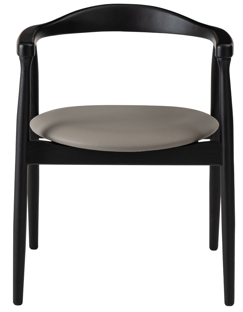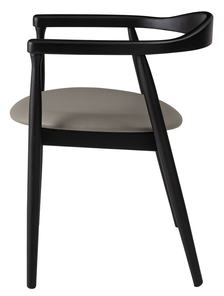 スタイリッシュなブラックフレームが、空間を引き締めながらも洗練されたアクセントに。座面にはメンテナンス性に優れた合成皮革を使用し、日常使いしやすく、美しさを保ちやすい仕様です。