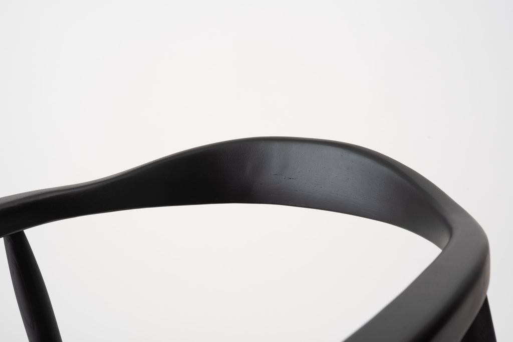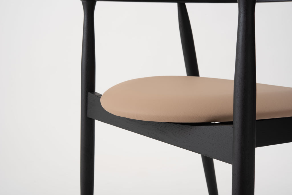 滑らかな曲線と上質な素材感が際立つアームチェア。背もたれからアームへと続く一体型のカーブは、丁寧に面取りされ、どこに触れてもやさしい手ざわりです。脚部には丸みをもたせたテーパードデザインを採用し、空間に柔らかな印象をもたらします。