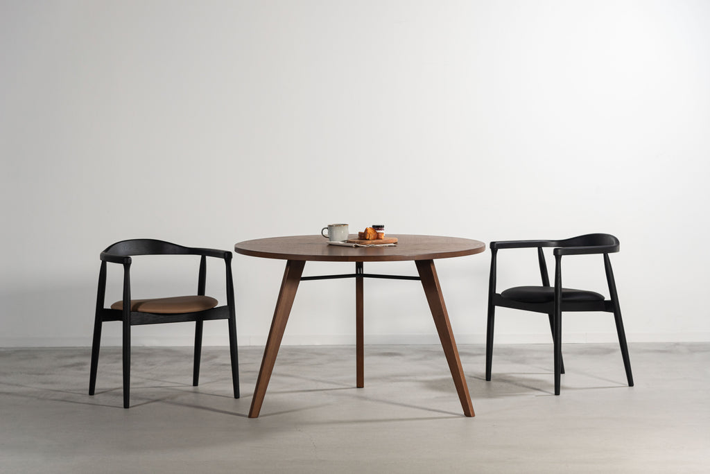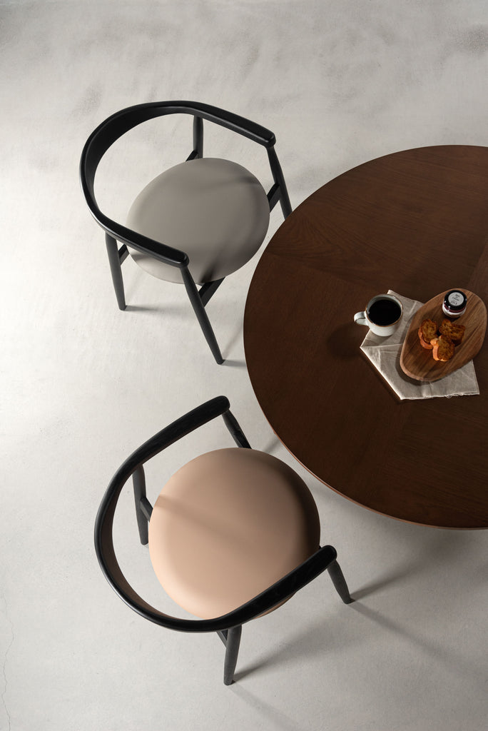 スタイリッシュなブラックフレームが、空間を引き締めながらも洗練されたアクセントに。座面にはメンテナンス性に優れた合成皮革を使用し、日常使いしやすく、美しさを保ちやすい仕様です。