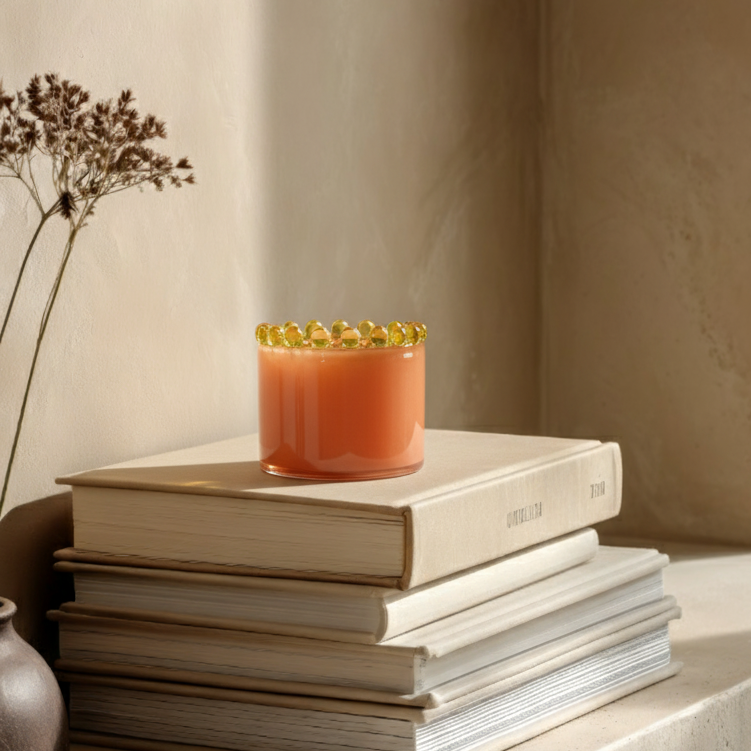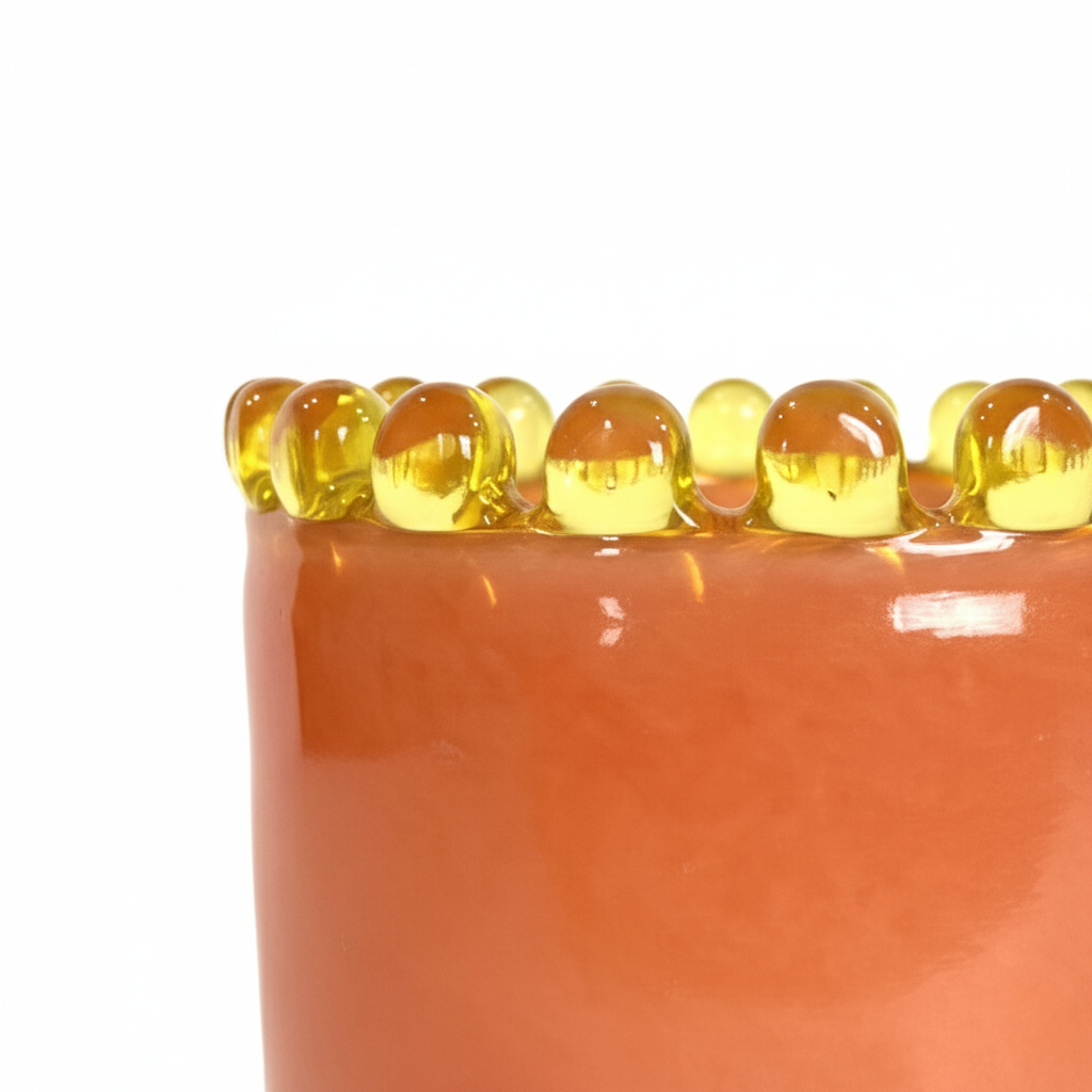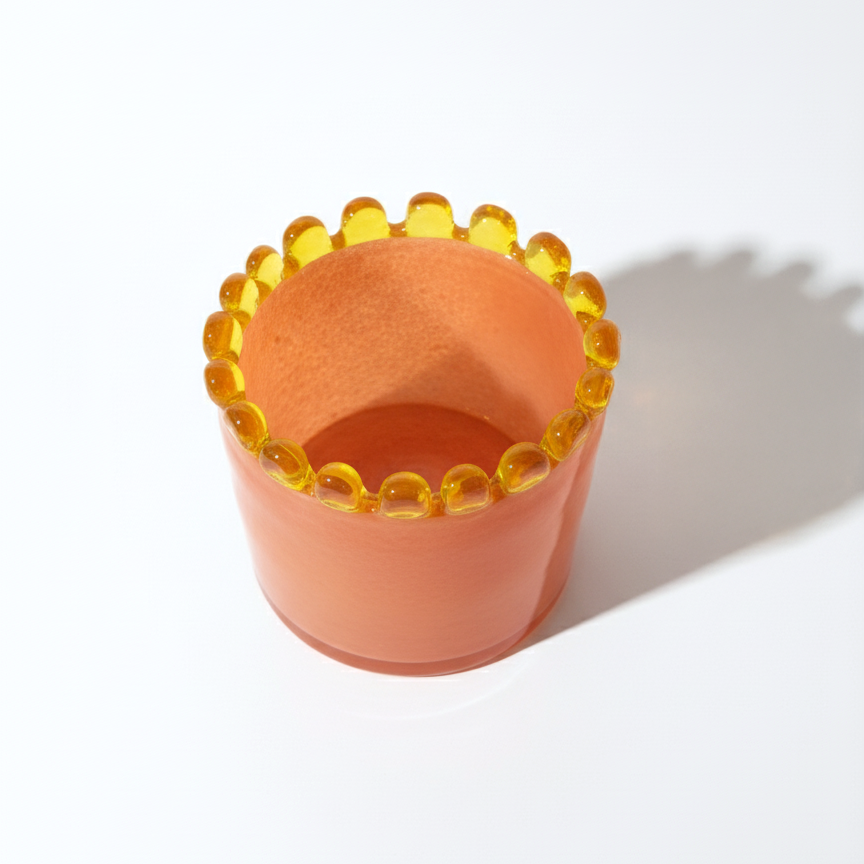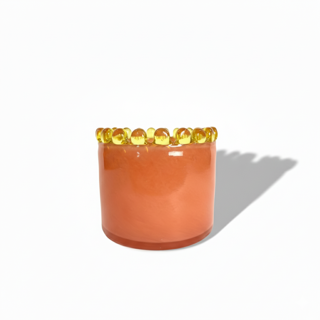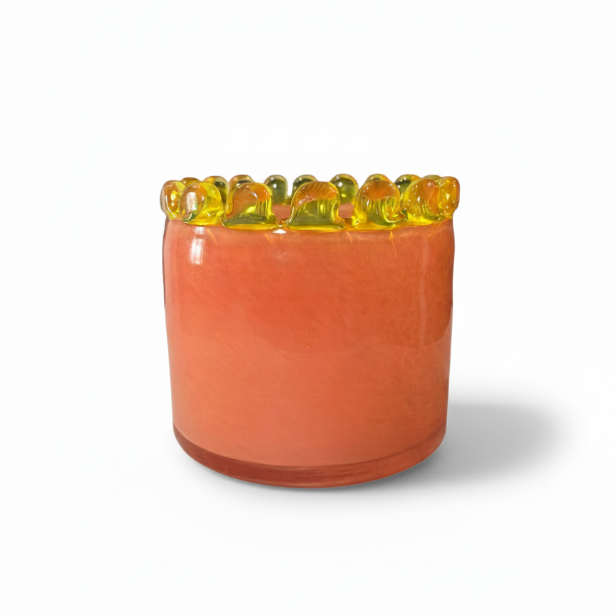 オレンジのポップなカラーのガラスは、花を一輪挿しても、何も入れずに飾っても絵になる存在感。Φ10.5×h9cmのコンパクトなサイズで、デスクのペン立てやキャンドルホルダーとしても活躍します。