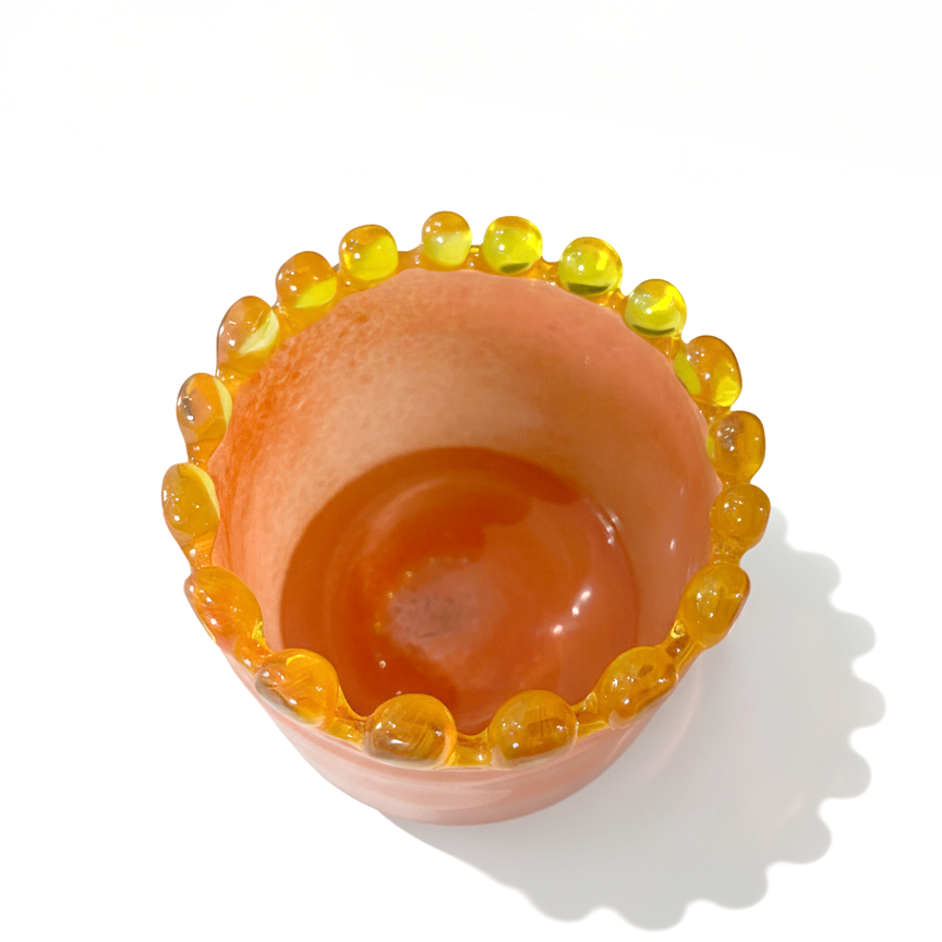 海中でゆらめくイソギンチャクを思わせる、やわらかなフォルムが印象的なガラスのフラワーベース。縁にあしらわれた透明感のあるガラスの粒が光を受けて輝き、静かな美しさを放ちます。