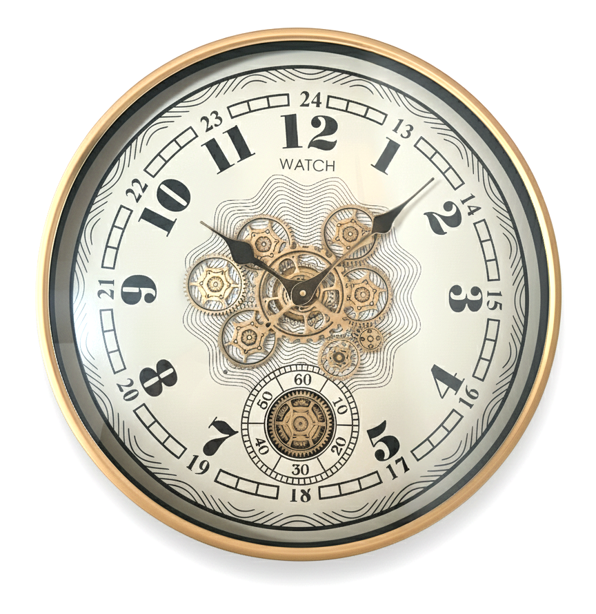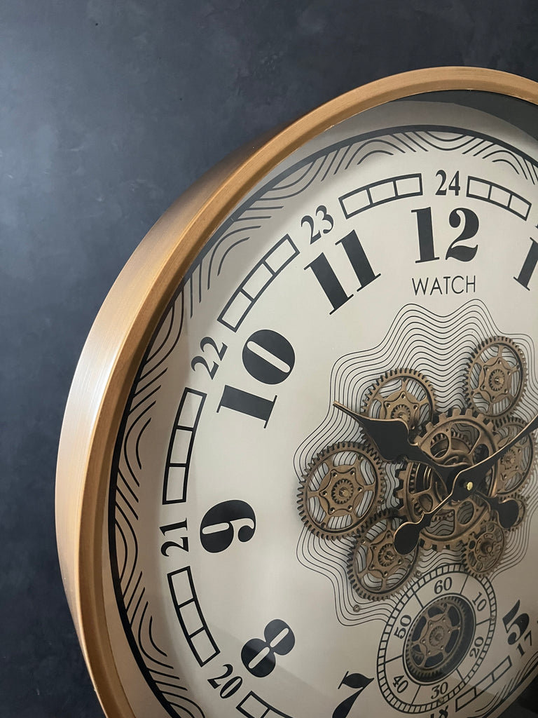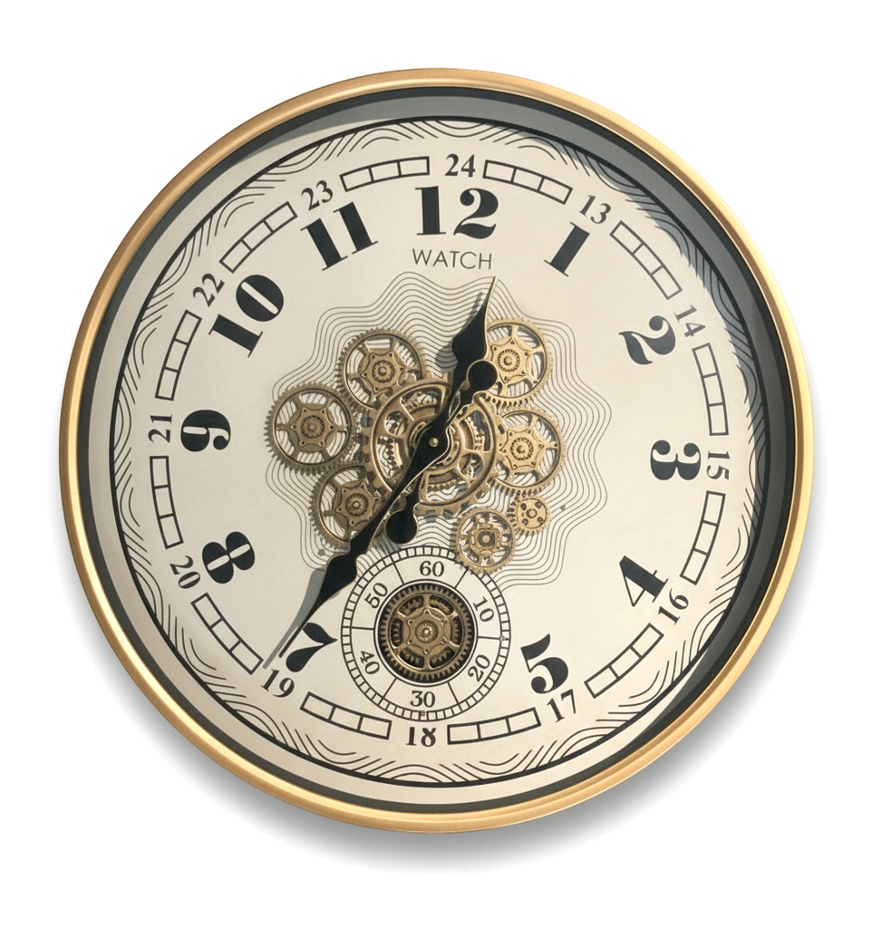 重厚なメタルフレームと真鍮調のギアディテールが融合したデザインは、機械式の美しさをそのままインテリアへと昇華させています。
