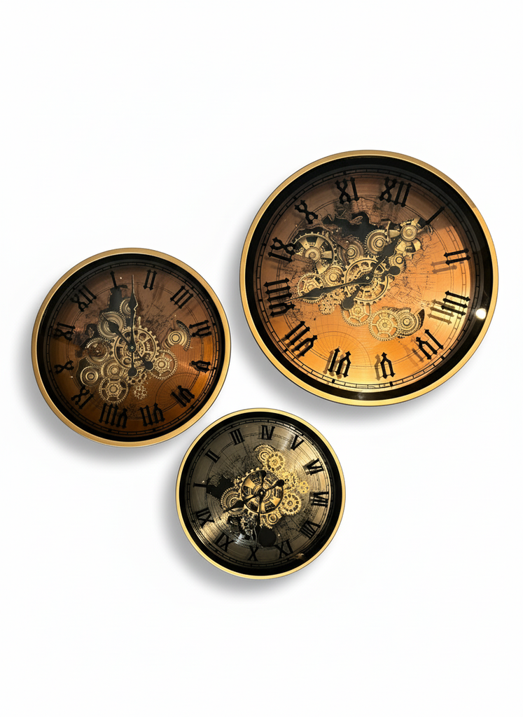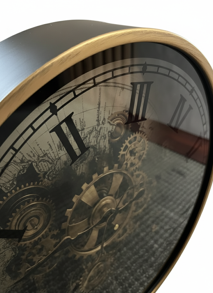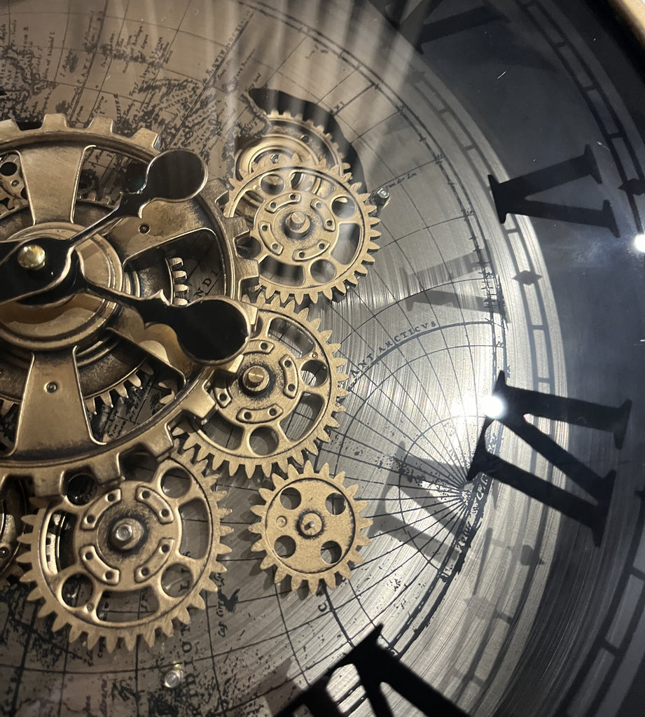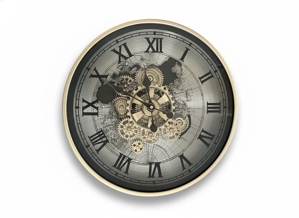 世界地図と精巧なギアモチーフが重なり合う、メカニカル アトラス ウォールクロック。