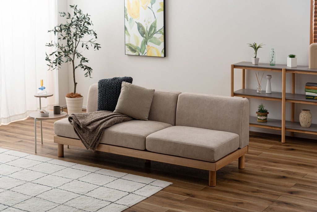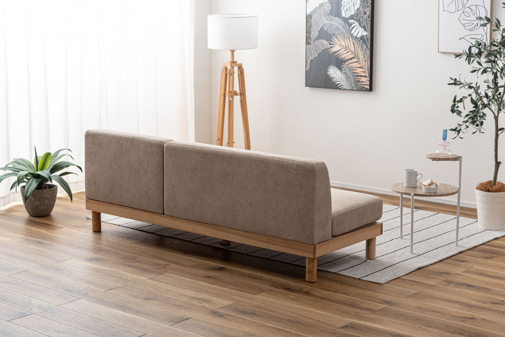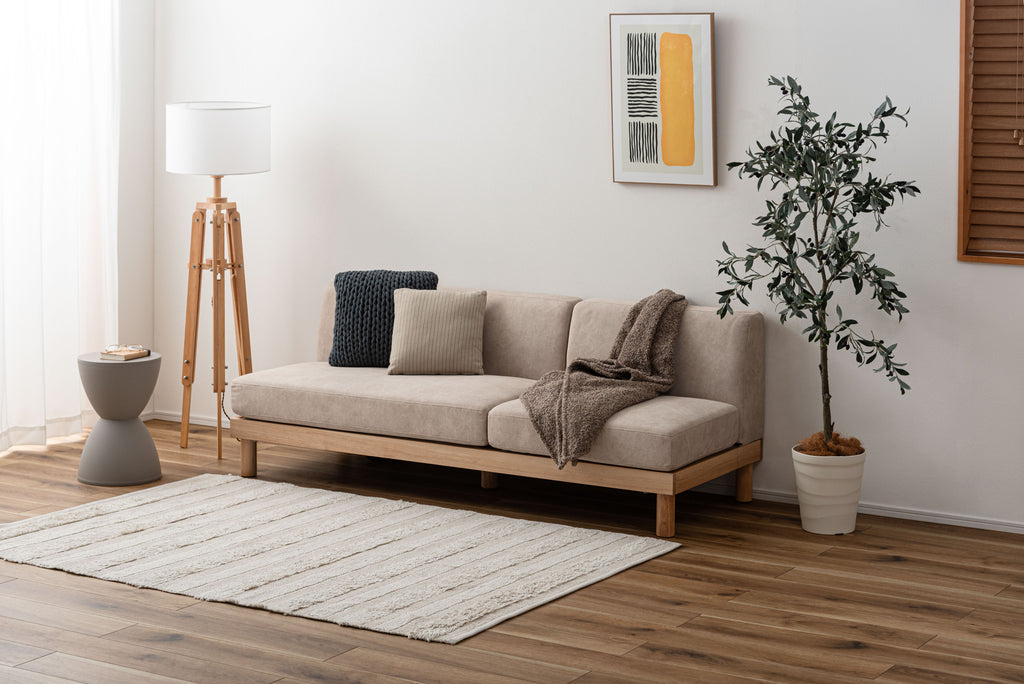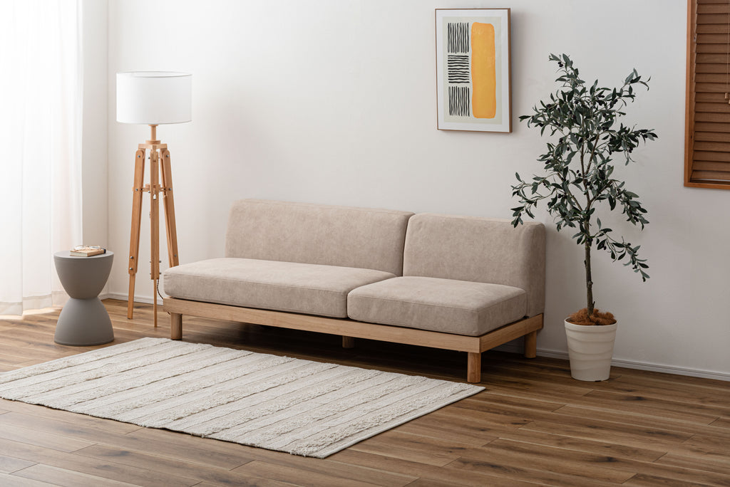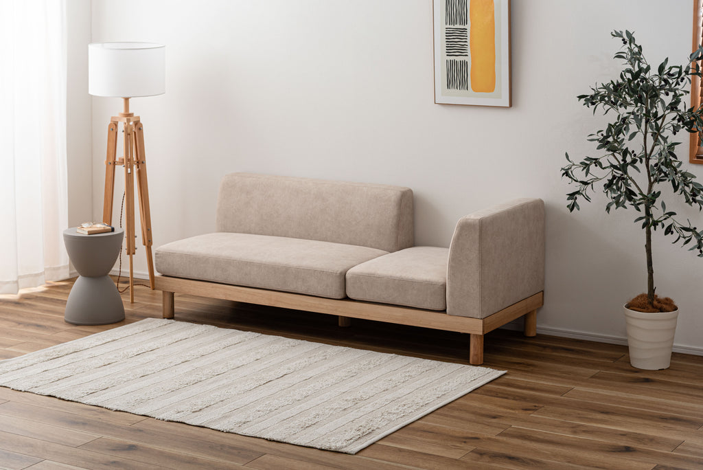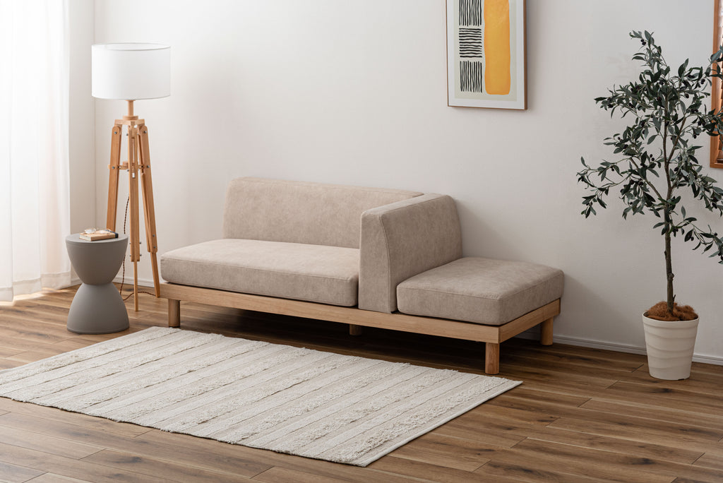 天然木フレームとファブリックの組み合わせが、リラックス感と上質感を両立。