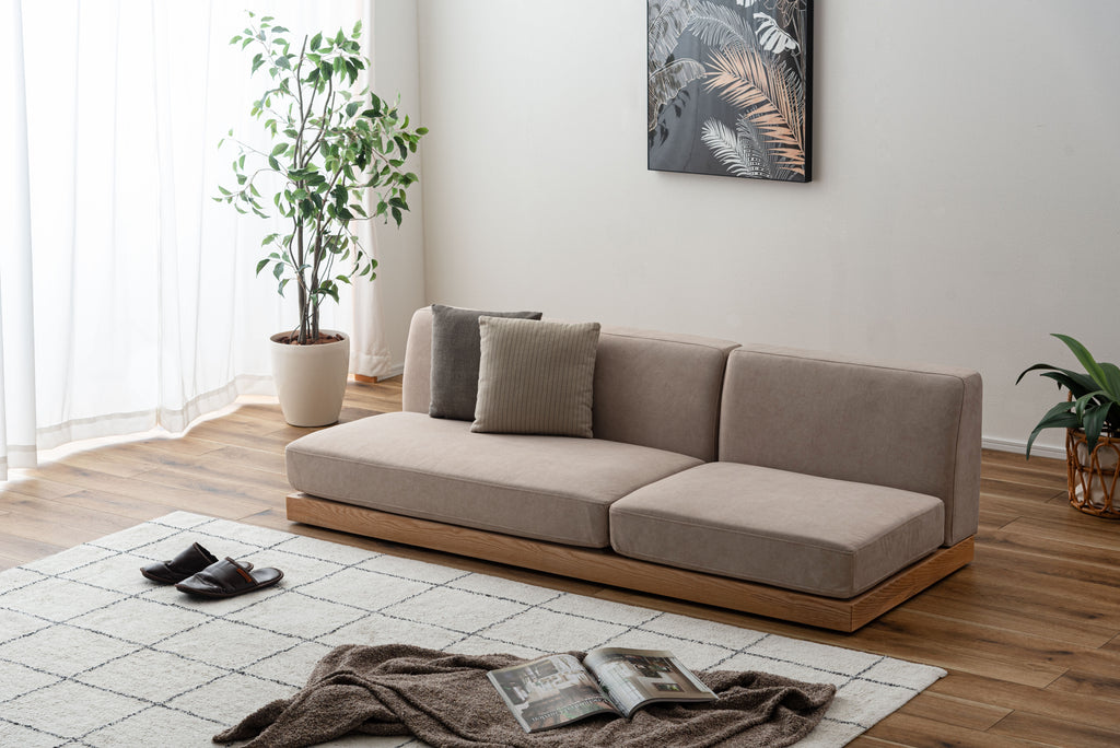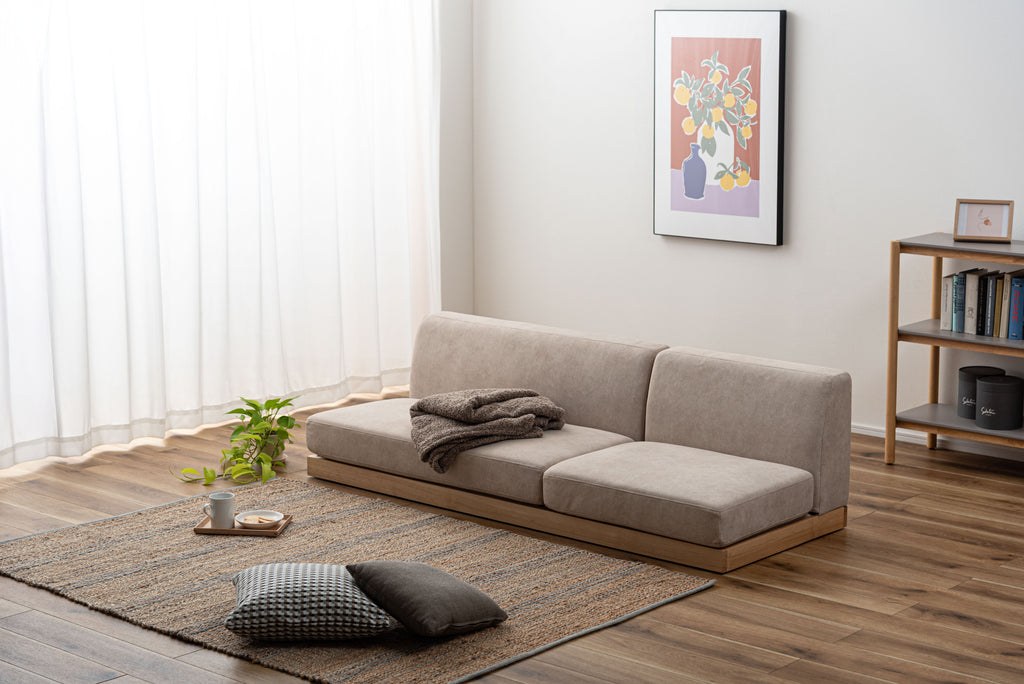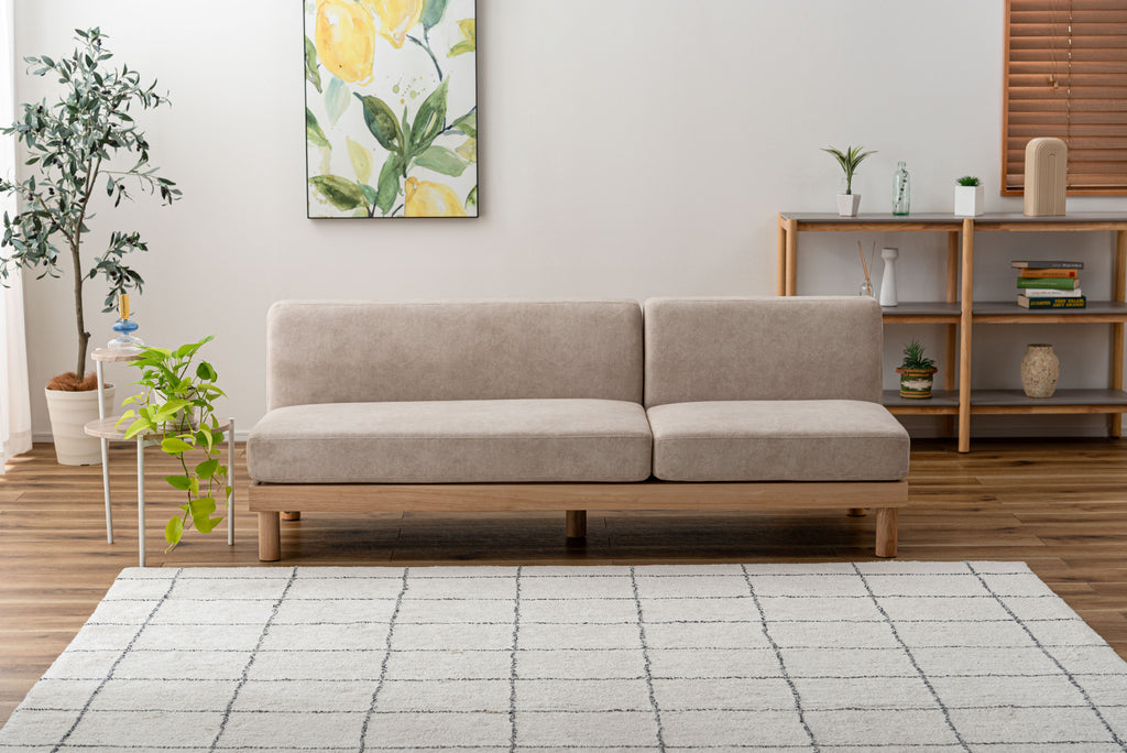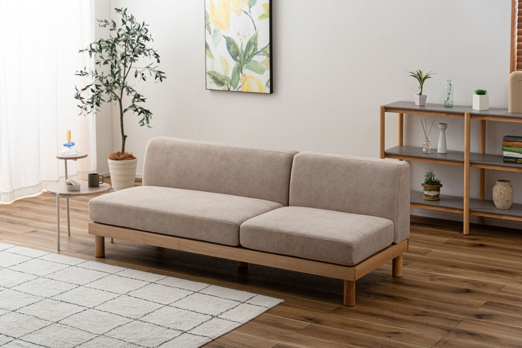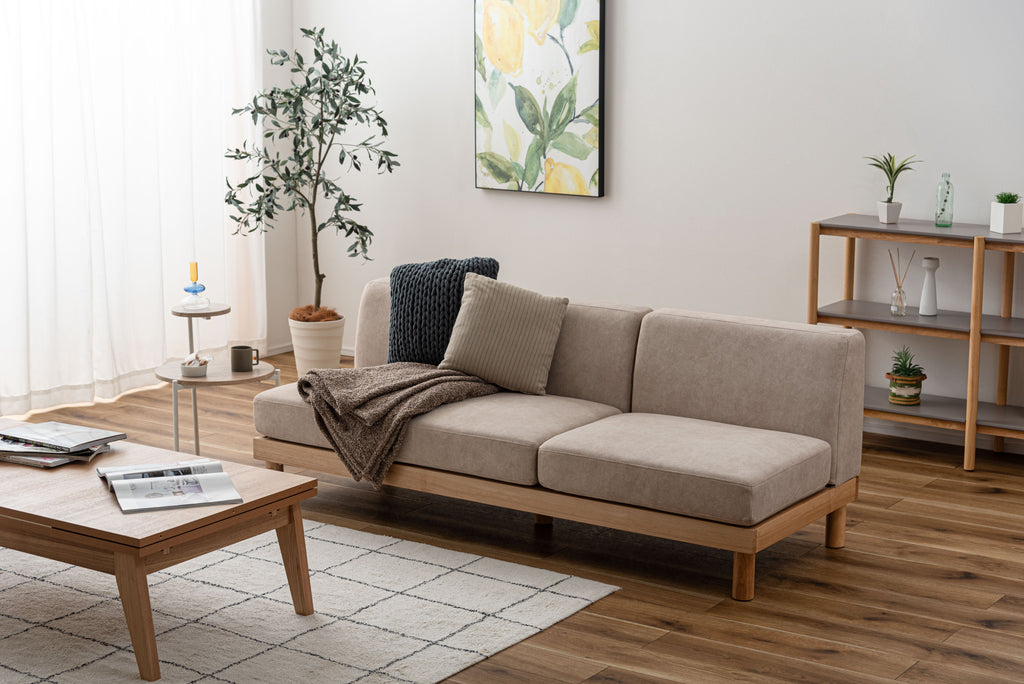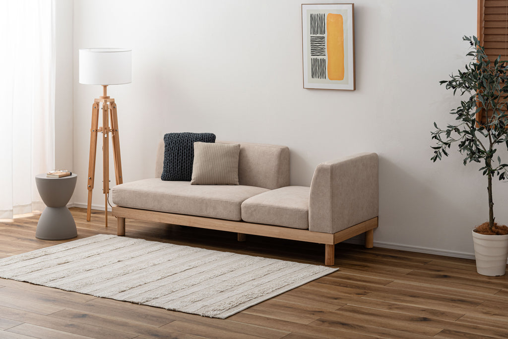 天然木フレームとファブリックの組み合わせが、リラックス感と上質感を両立。