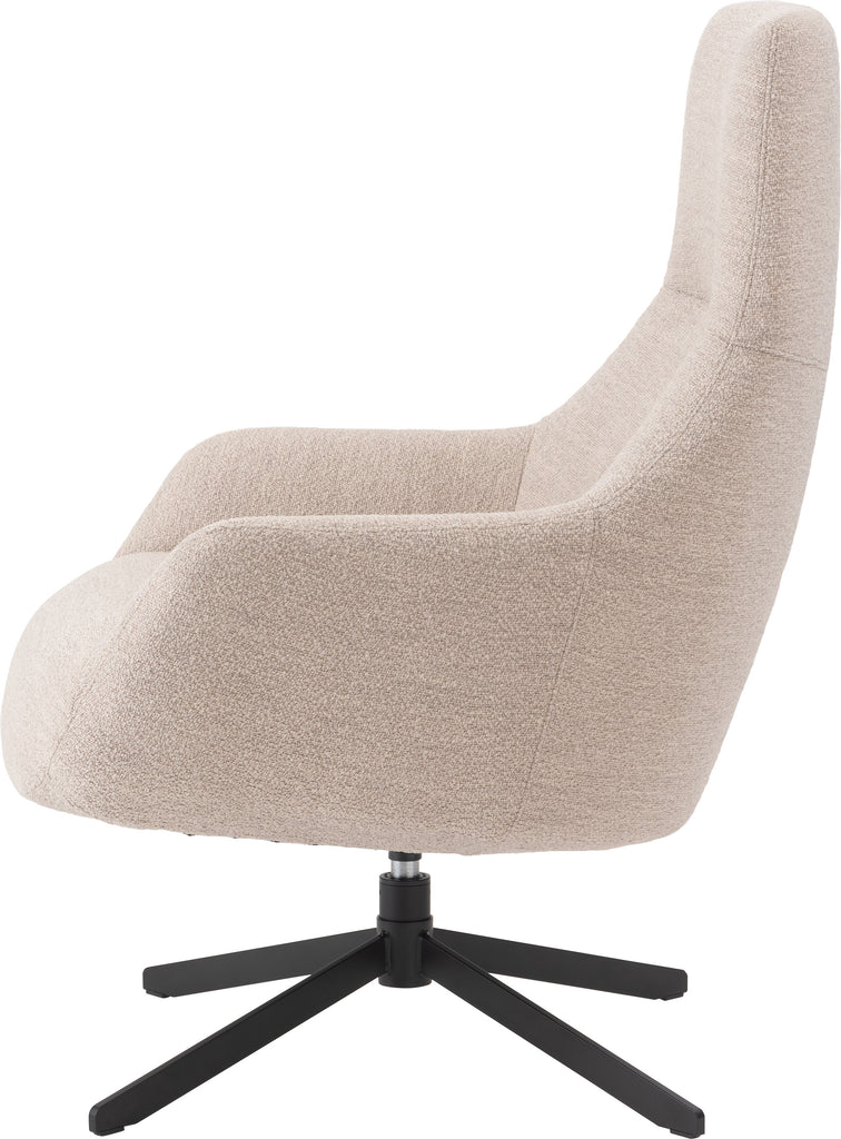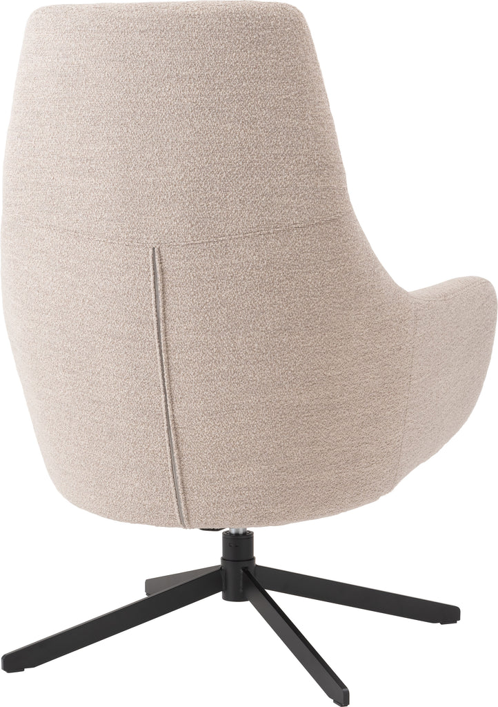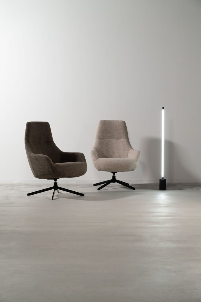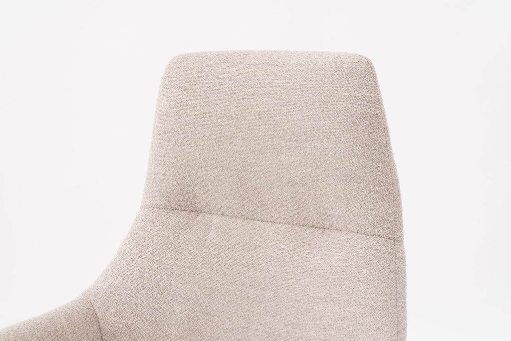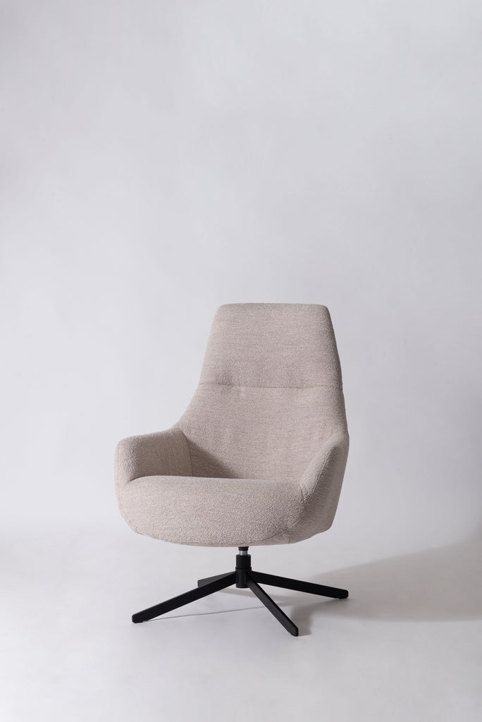 しっかりとしたハイバック仕様で長時間座っても快適。シンプルながらも印象的なデザインは、包み込まれるような心地よさを追求し、柔らかな曲線が身体をやさしく支えます。座面には360度回転機能を備え、限られたスペースでもスムーズな立ち座りが可能。デザイン性と機能性を両立し、ラウンジやオフィス空間にも上品に調和します。