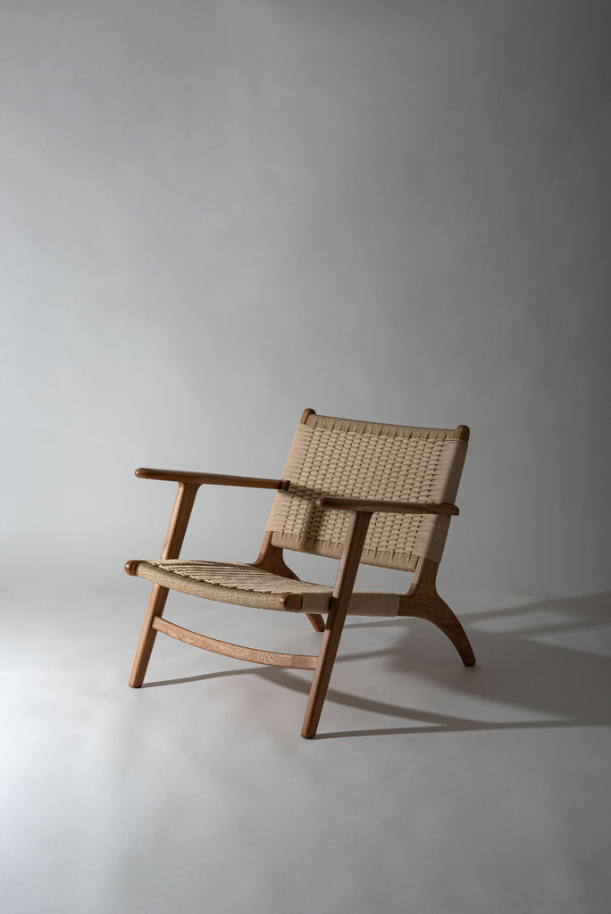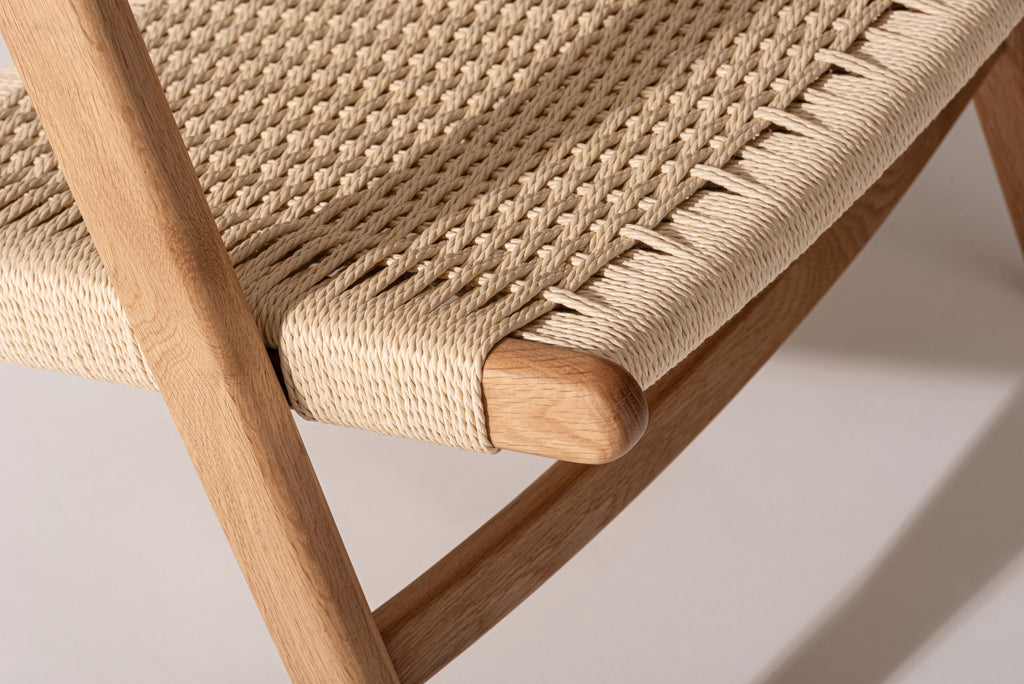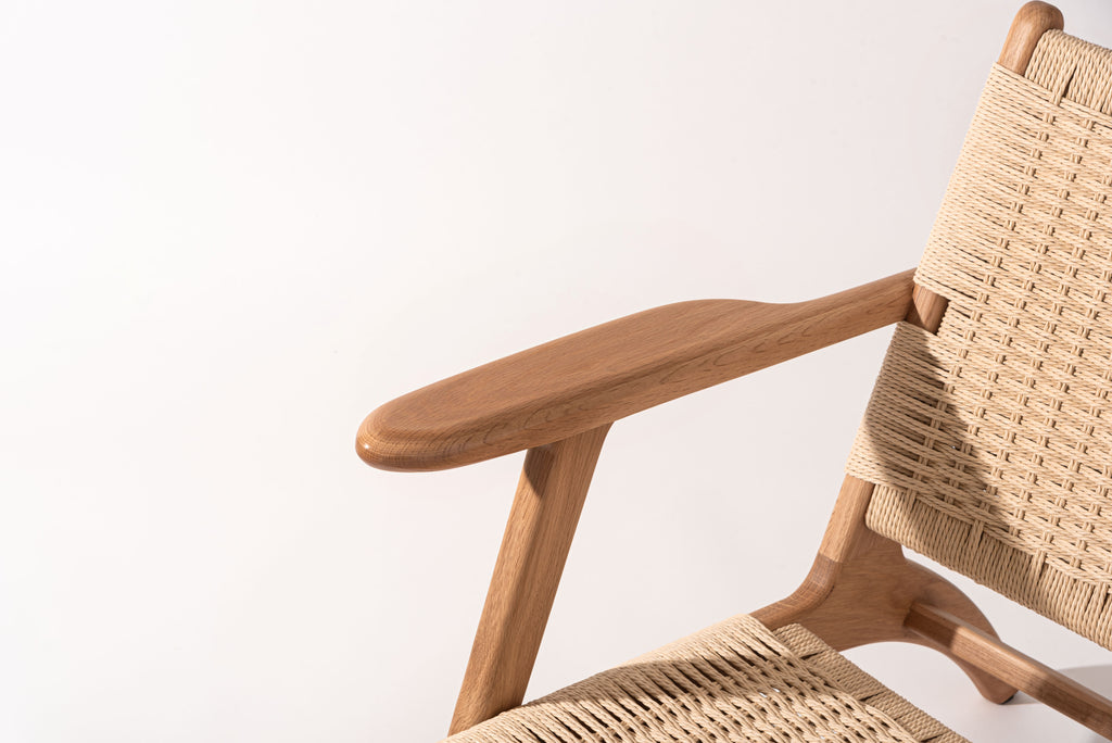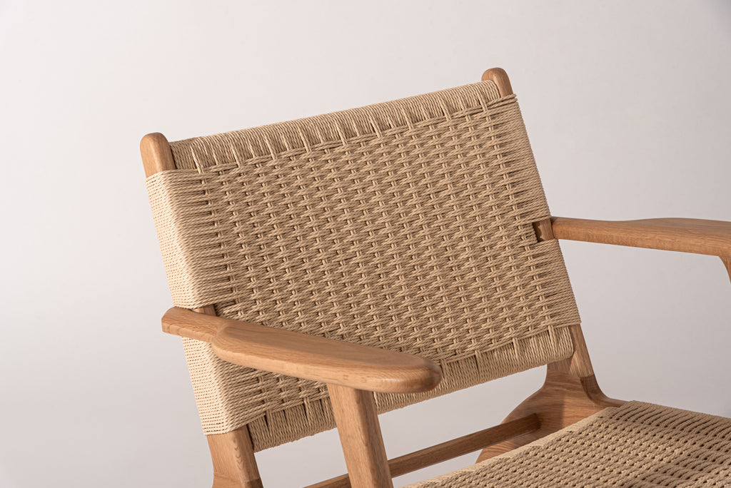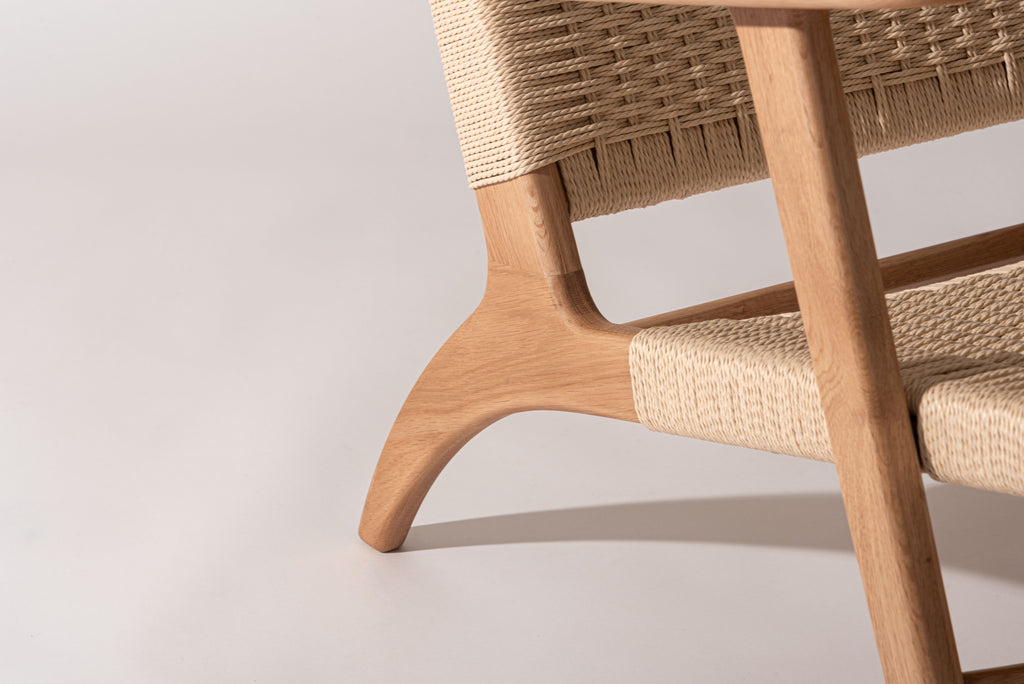 オーク無垢材のフレームに、長く使い込むほどに身体に馴染むペーパーコードを使用しております。座面後方に向け緩やかに下げた傾斜が心地よい座り心地を生み出します。アーム先端は触感と見た目の美しさを追求し、上下左右の曲線を入れ仕上げました。