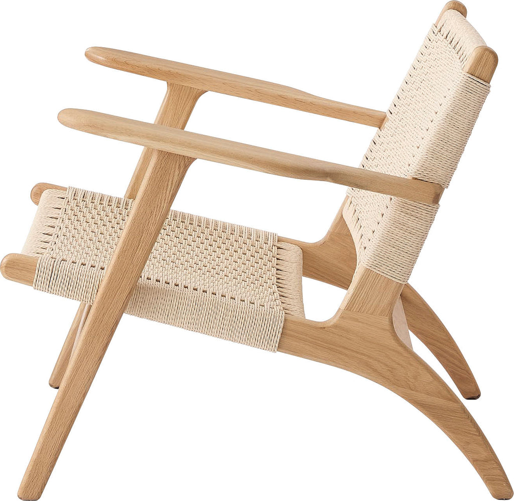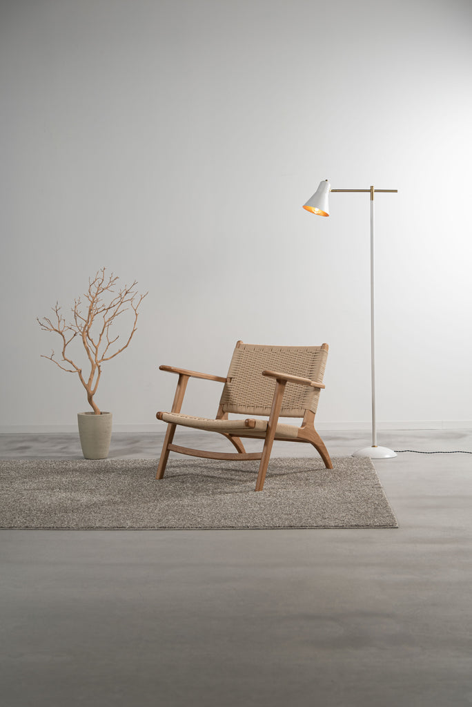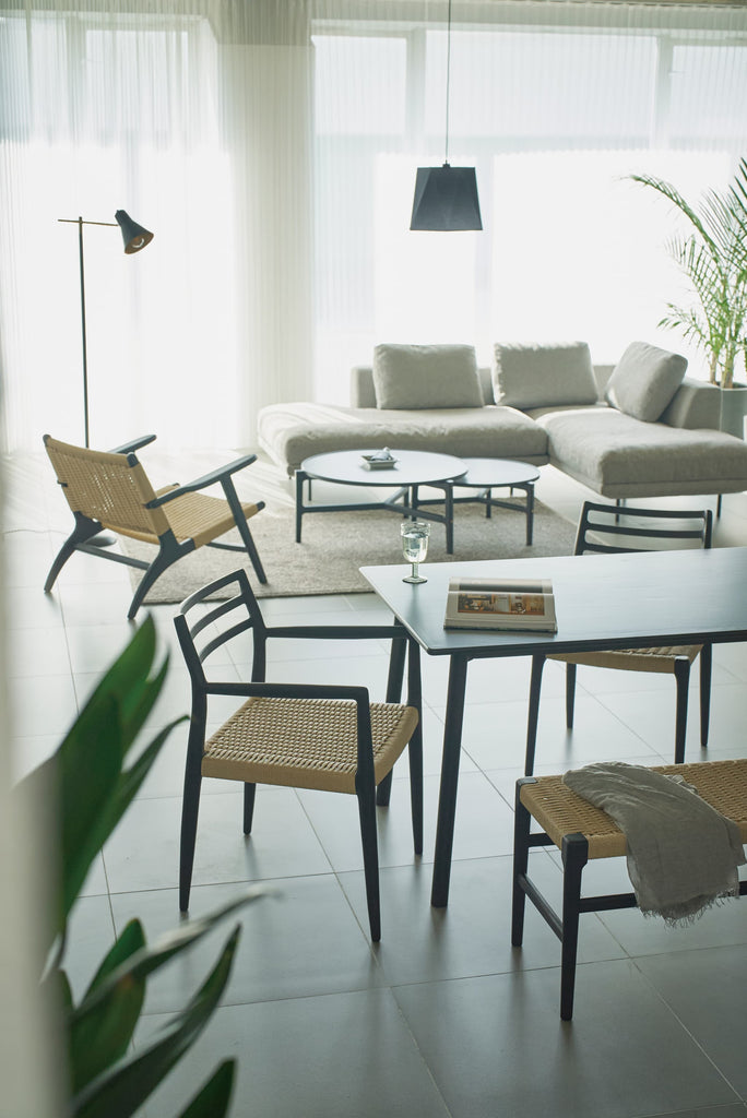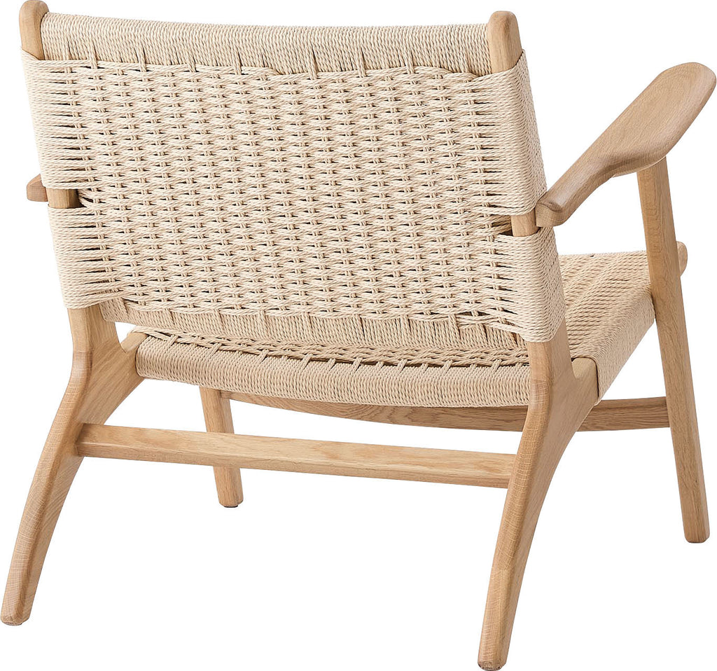 オーク無垢材のフレームに、長く使い込むほどに身体に馴染むペーパーコードを使用しております。座面後方に向け緩やかに下げた傾斜が心地よい座り心地を生み出します。アーム先端は触感と見た目の美しさを追求し、上下左右の曲線を入れ仕上げました。