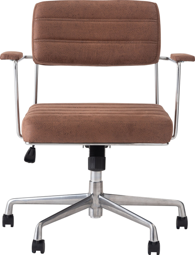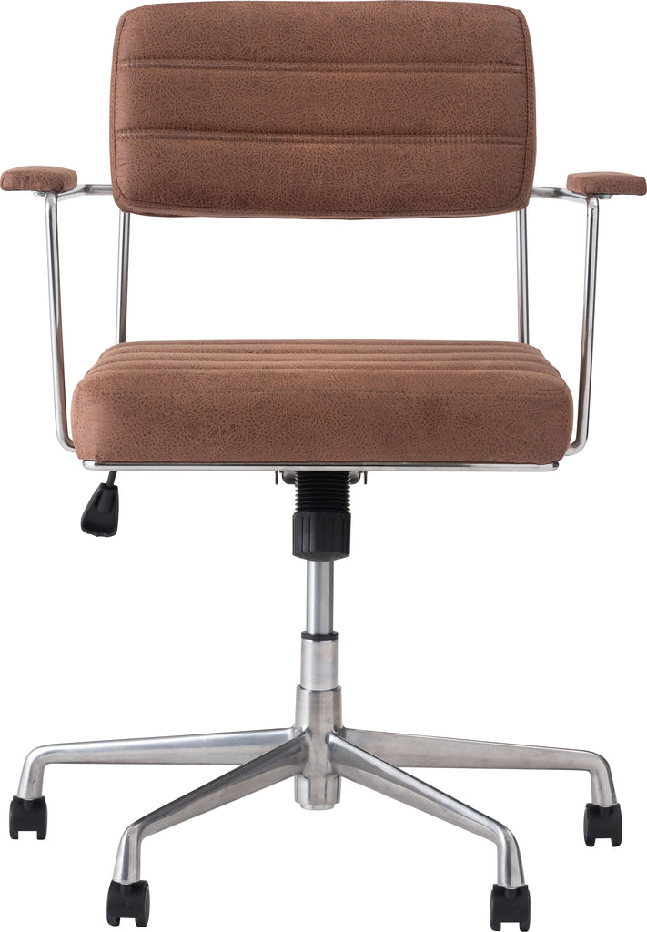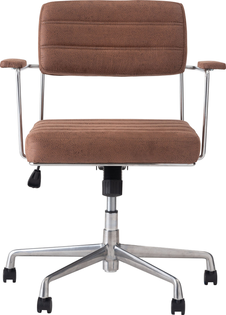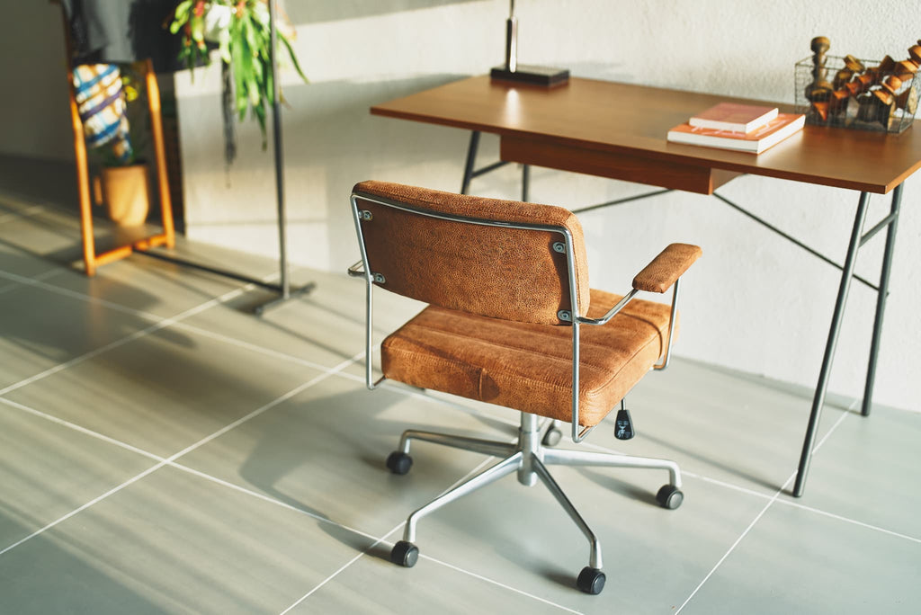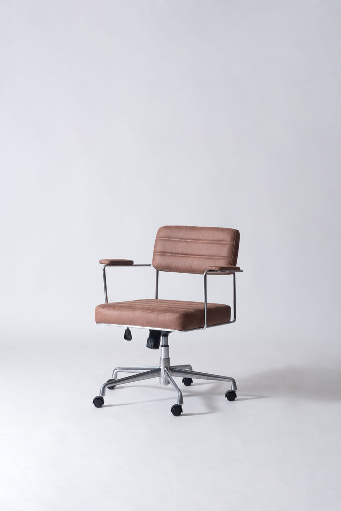直線的なフォルムとヴィンテージ感のある素材が調和した、ボルゴ デスクチェア。水平に入ったステッチが程よいアクセントとなり、シンプルながらも印象に残るデザインに仕上げています。