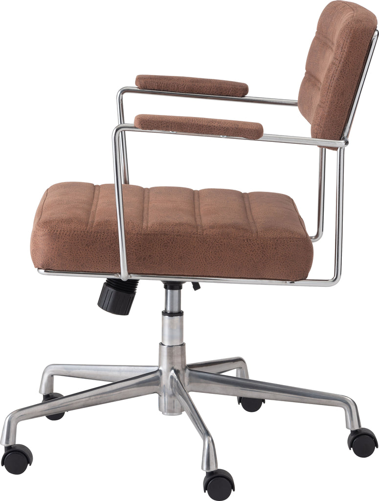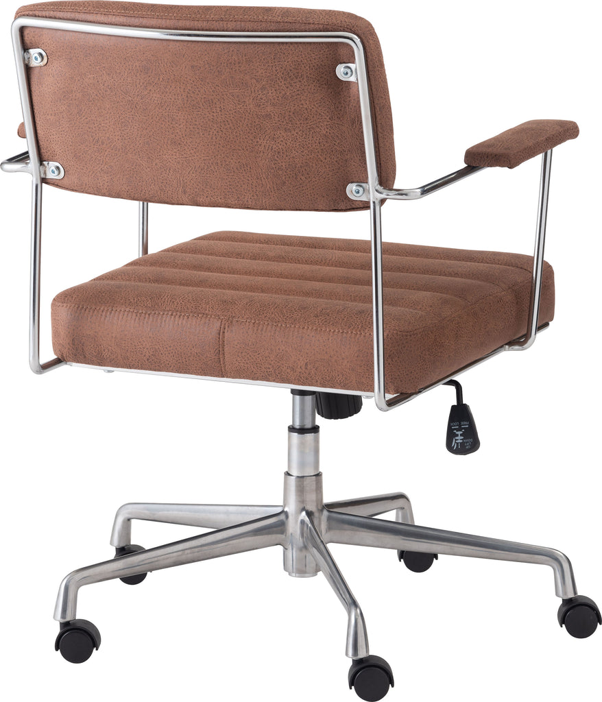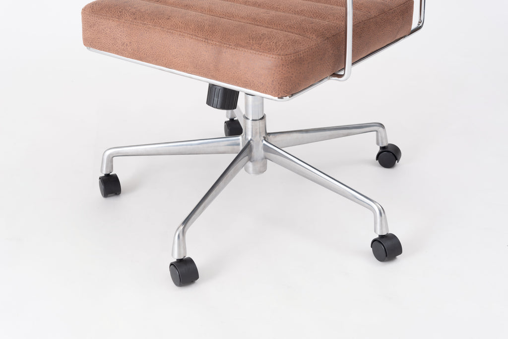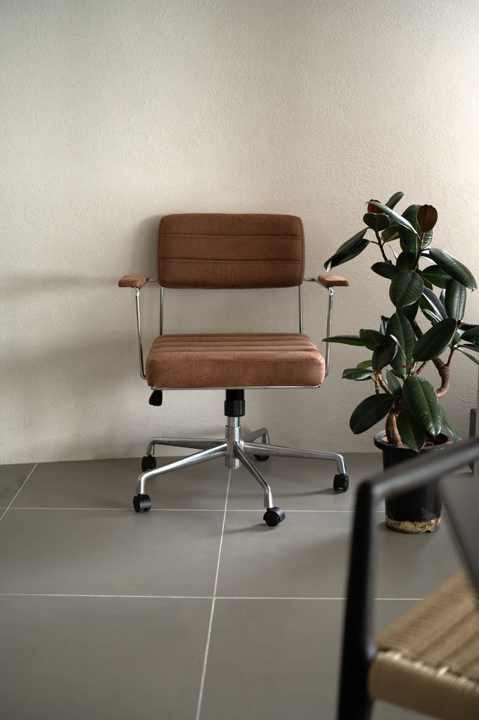直線的なフォルムとヴィンテージ感のある素材が調和した、ボルゴ デスクチェア。水平に入ったステッチが程よいアクセントとなり、シンプルながらも印象に残るデザインに仕上げています。