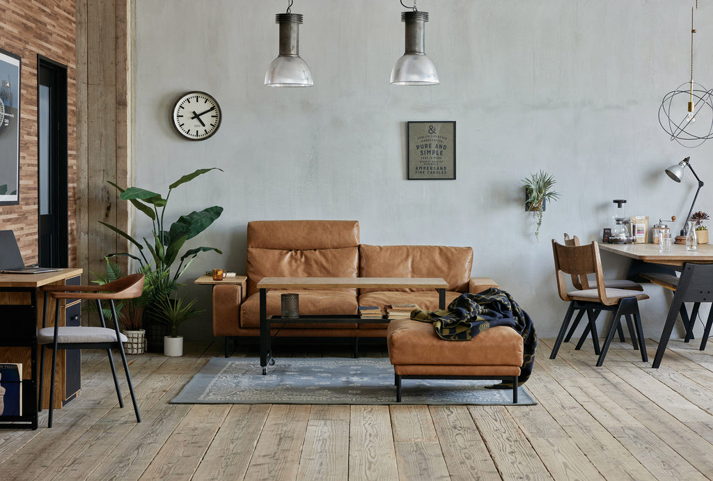 ヴィンテージソファを思わせるルーズな張り感と、すっきりとしたブラックスチール脚のコントラストが、空間にほどよい抜け感をプラス。シンプルでありながら存在感のある佇まいに仕上げています。