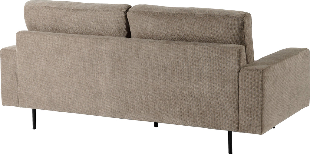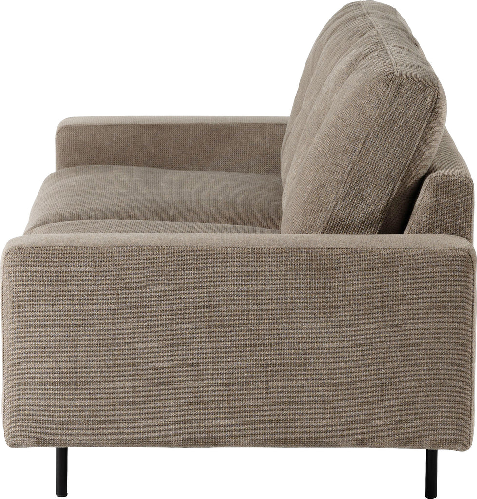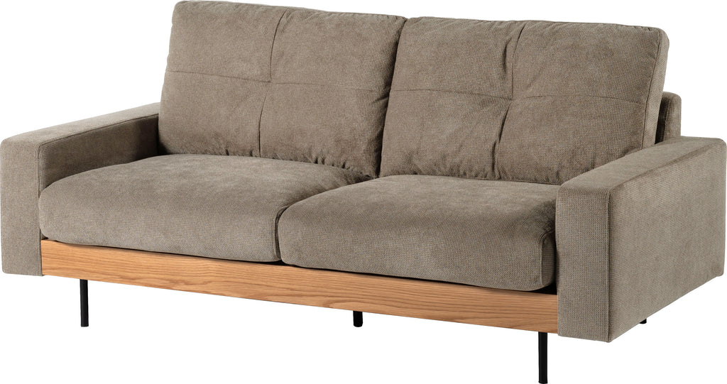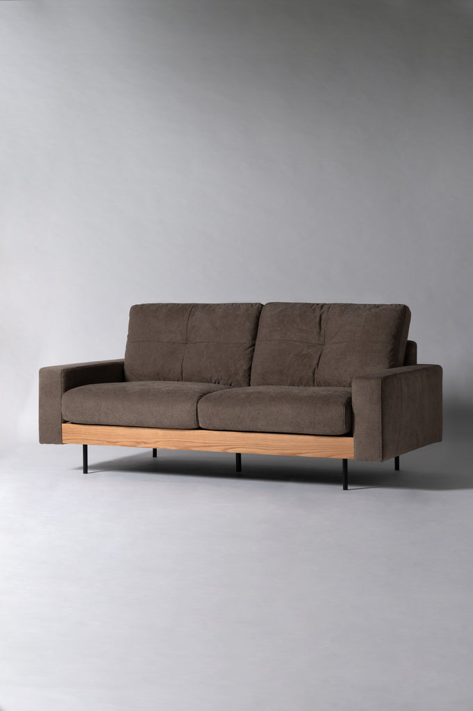 上質なファブリックと天然木を使用した幕板、そして細さを追求したスチール脚が、空間にクールでモダンな印象をもたらす2人掛けソファ。