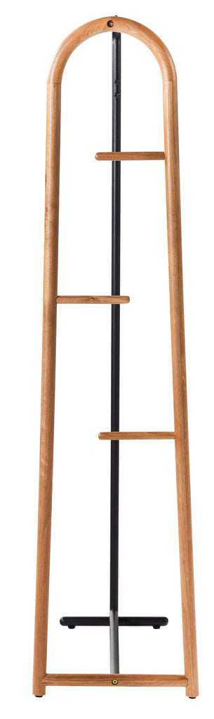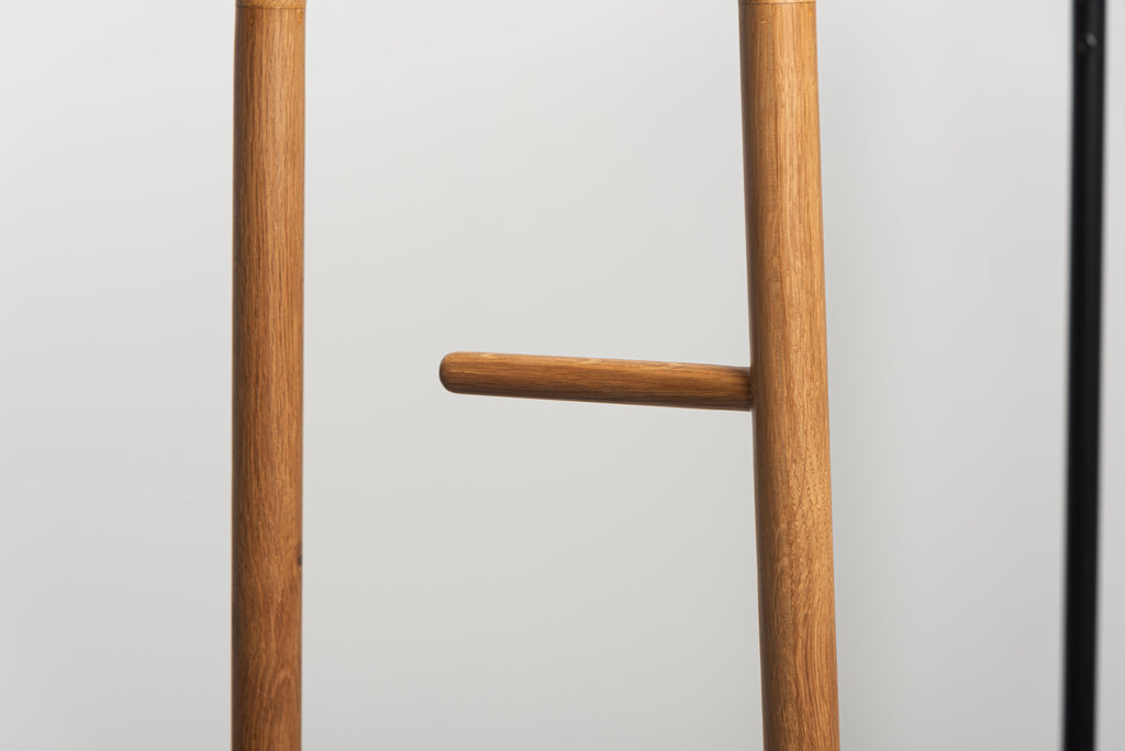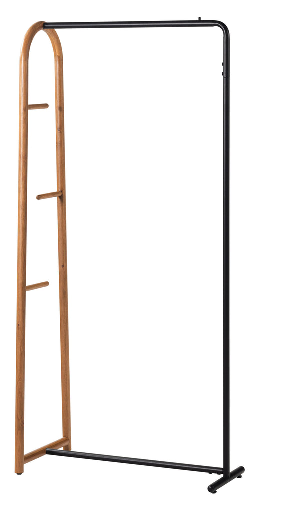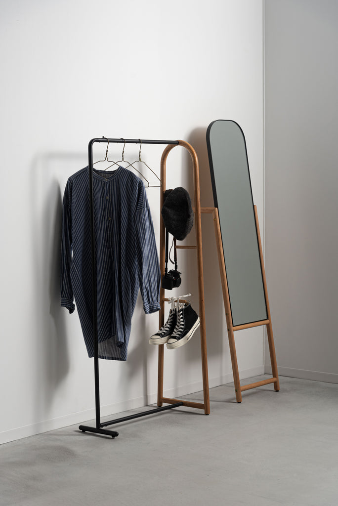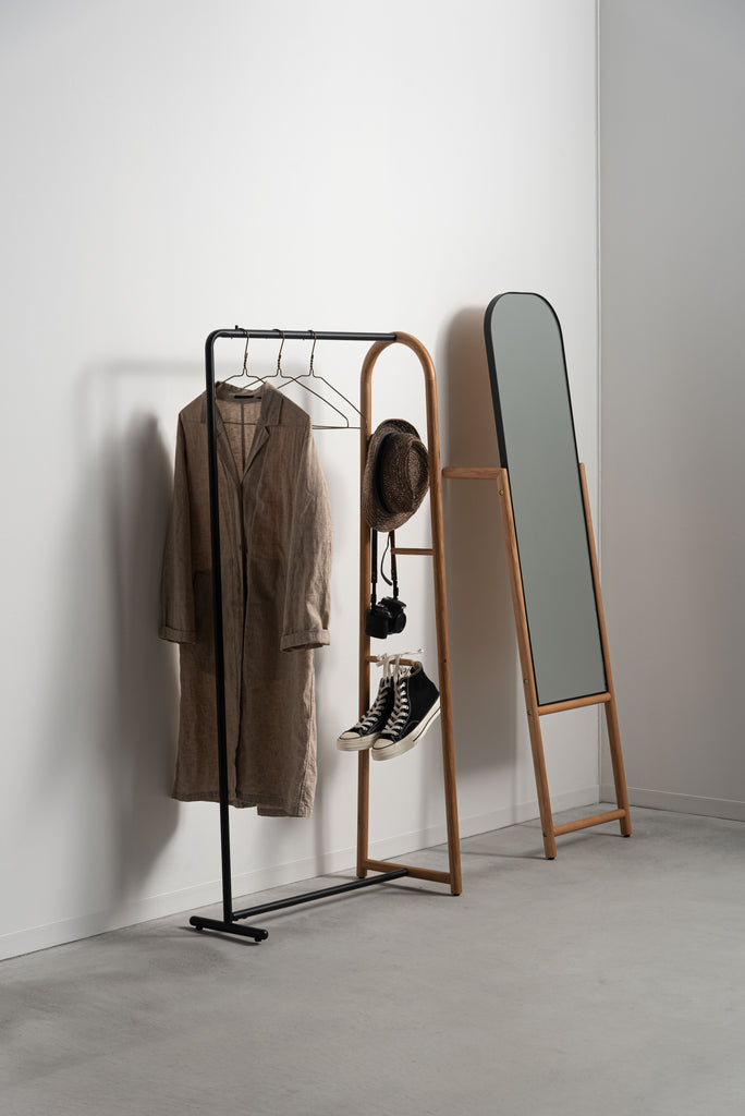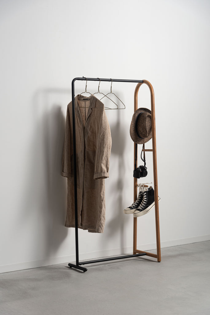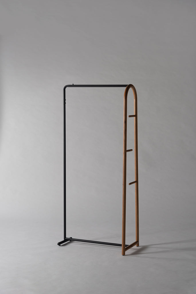 オーク材の温もりと、スチールのシャープさを組み合わせた、異素材ミックスが魅力のハンガーラック。片側に設けた木製フレームには、左右交互に配置したサイドバーを備え、衣類と小物をすっきりまとめて掛けられる実用的なデザインに仕上げています。