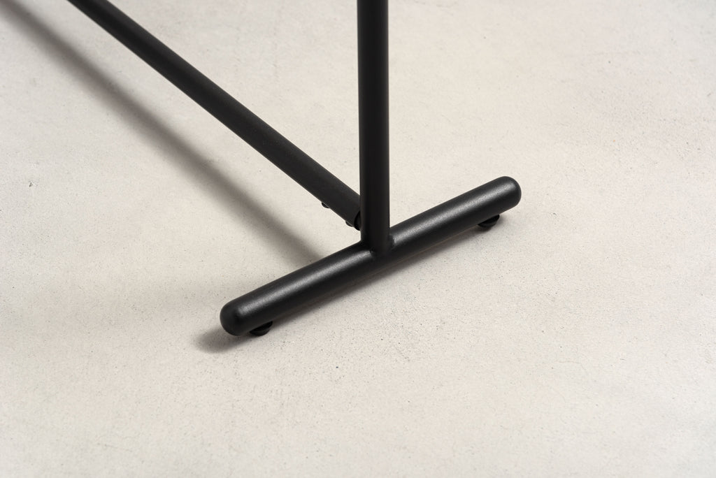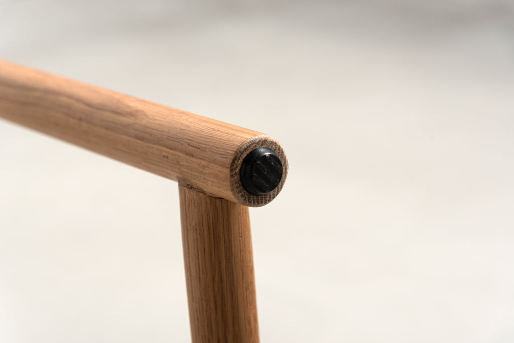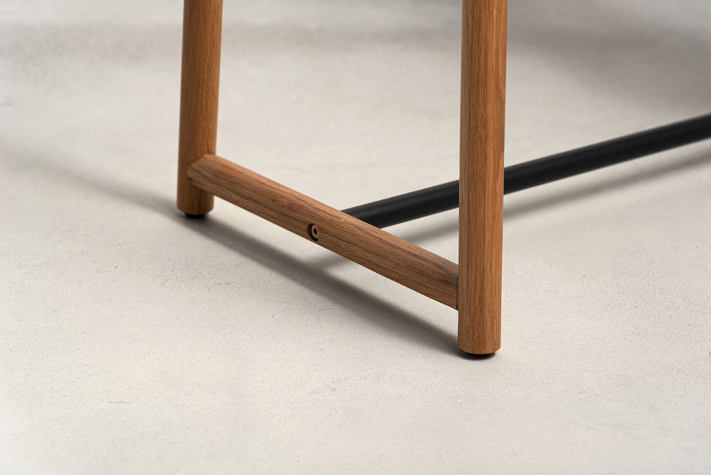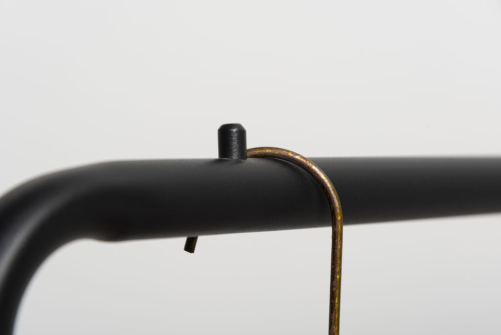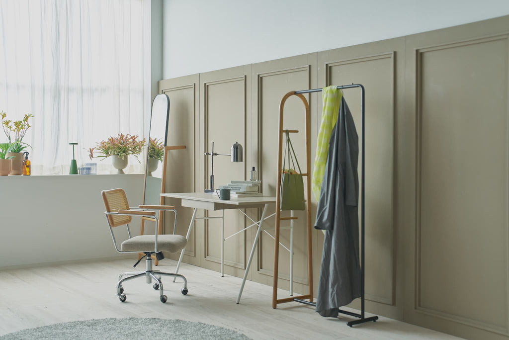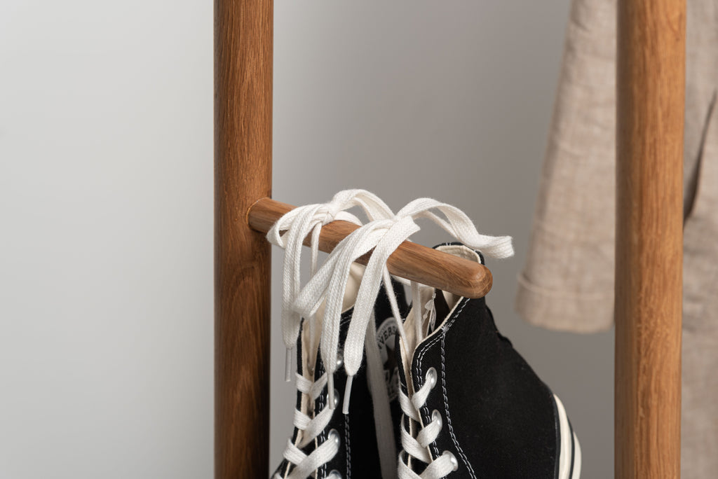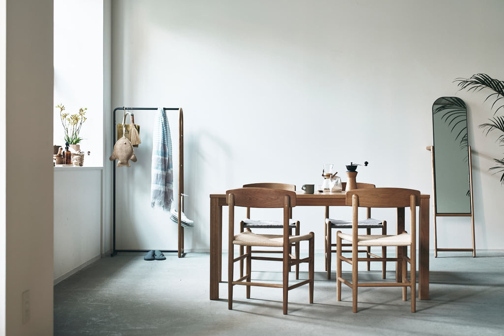 オーク材の温もりと、スチールのシャープさを組み合わせた、異素材ミックスが魅力のハンガーラック。片側に設けた木製フレームには、左右交互に配置したサイドバーを備え、衣類と小物をすっきりまとめて掛けられる実用的なデザインに仕上げています。